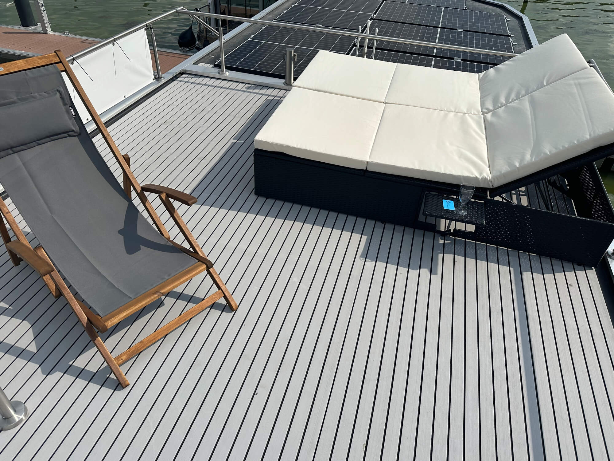 Der Wohn- und Essbereich begeistert durch stilvolle Einrichtung und einen dreiseitigen Blick aufs Wasser. Über die große Schiebetür gelangen Sie direkt auf die Terrasse mit Steuerstand. Von hier führt eine Leiter auf die Dachterrasse, ein perfekter Ort zum Entspannen und Genießen.